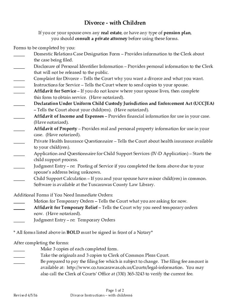 DivorcewithChildren Ifyouoryourspouseownanyrealestate, orhaveanytypeofpensionplan, youshouldconsultaprivateattorneybeforeusingtheseforms. Formstobecompletedbyyou: ___ DomesticRelationsCaseDesignationFormProvidesinformationtotheClerkabout