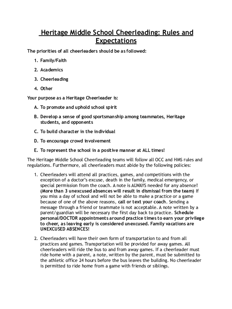 Heritage Middle School Cheerleading: Rules and Expectations The priorities of all cheerleaders should be as followed: 1. Family/Faith 2. Academics 3. Cheerleading 4. Other Your purpose as a Heritage