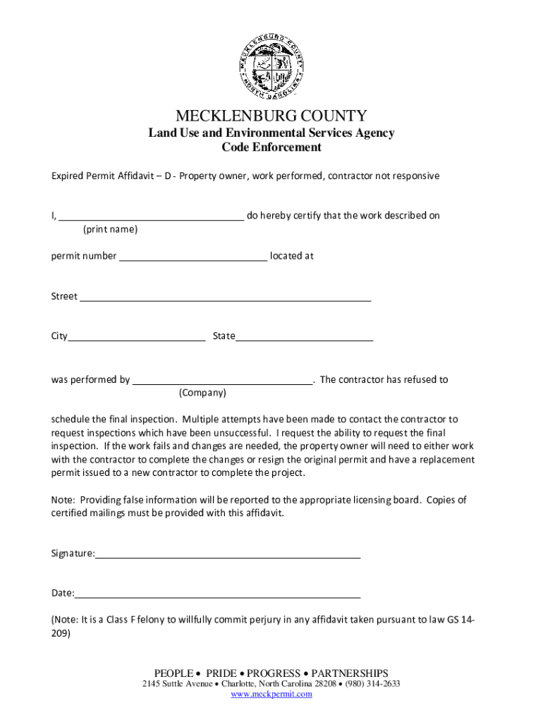 MECKLENBURG COUNTY Land Use and Environmental Services Agency Code Enforcement Expired Permit Affidavit D Property owner, work performed, contractor not responsive I, ___ do hereby certify that the