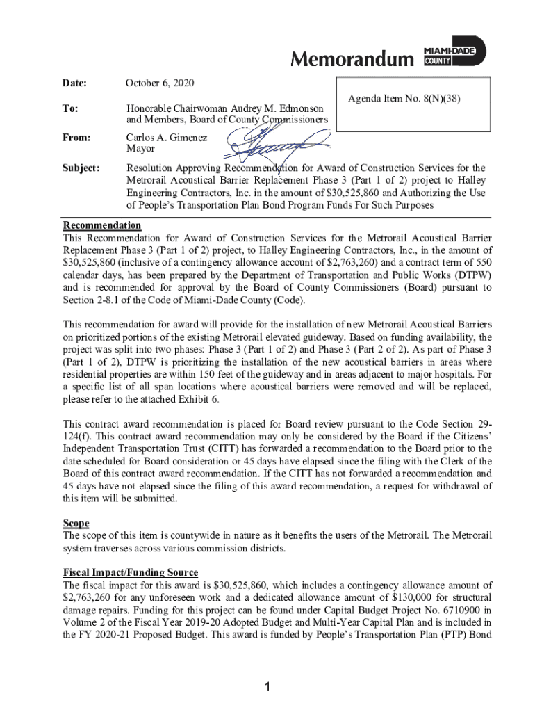 Date:October 6, 2020To:Honorable Chairwoman Audrey M. Edmonson and Members, Board of County CommissionersFrom:Carlos A. Giménez MayorSubject:Resolution Approving Recommendation for Award of Construction