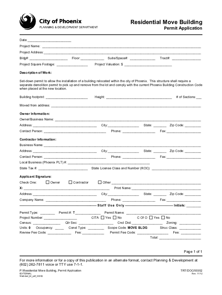 Residential Move BuildingPermit ApplicationDate:___ Project Name: ___ Project Address: ___ Bldg#: ___Floor: ___Project Square Footage: ___Suite/Space#: ___Tract#: ___Project Valuation: $ ___Description