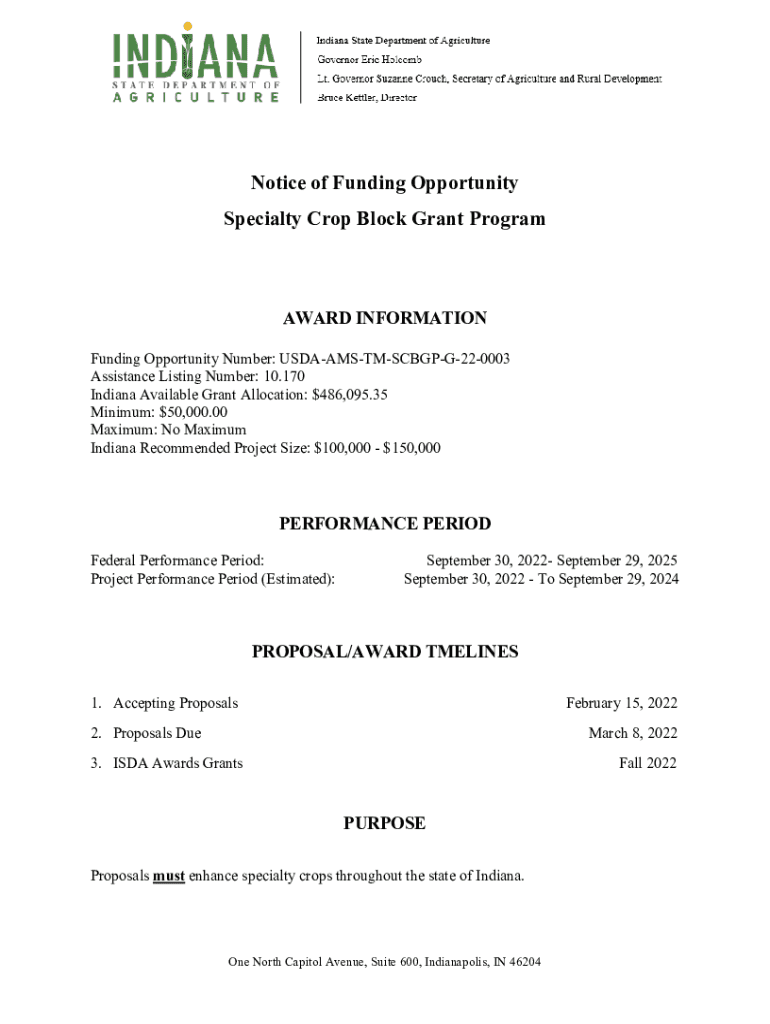 Notice of Funding Opportunity Specialty Crop Block Grant ProgramAWARD INFORMATION Funding Opportunity Number: USDAAMSTMSCBGPG220003 Assistance Listing Number: 10.170 Indiana Available Grant Allocation: