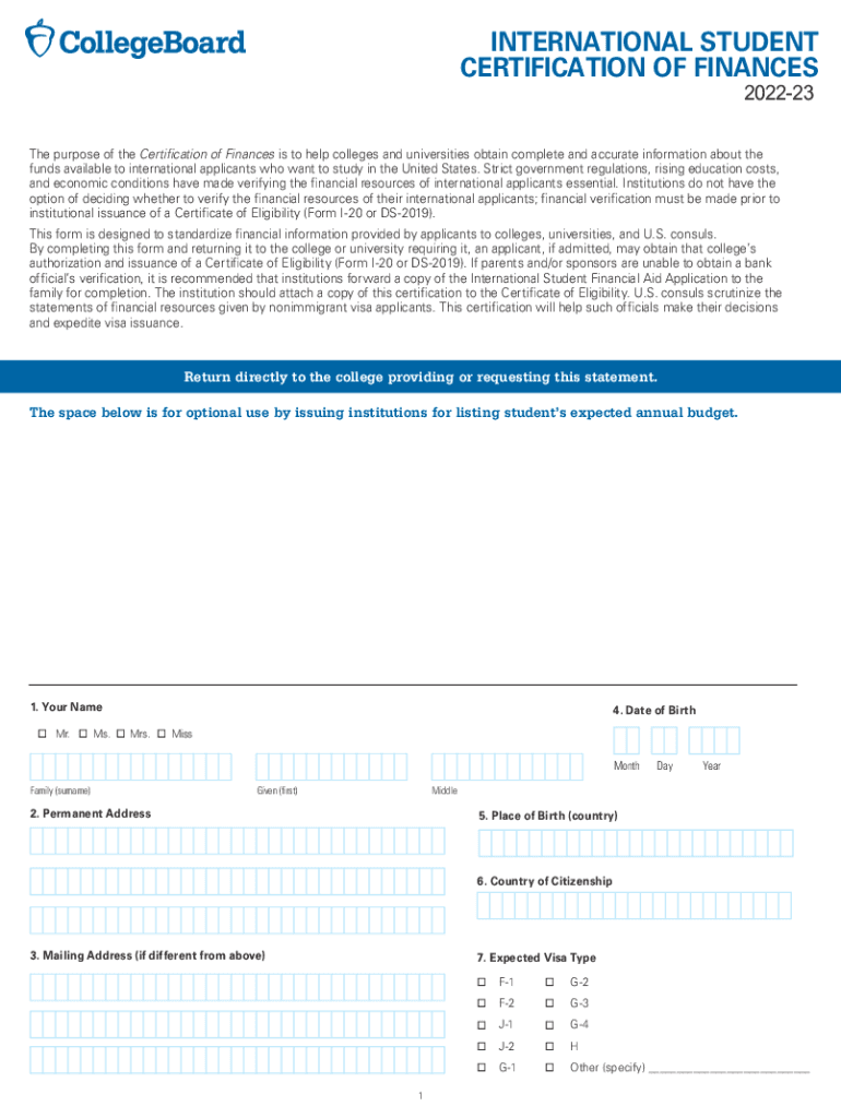 INTERNATIONAL STUDENT CERTIFICATION OF FINANCES 202223The purpose of the Certification of Finances is to help colleges and universities obtain complete and accurate information about the funds available