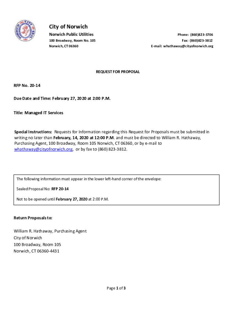 City of Norwich Public UtilitiesPhone: (860)8233706100 Broadway, Room No. 105 Norwich, CT 06360Fax: (860)8233812 Email: Hathaway×cityofnorwich.request FOR PROPOSAL RFP No. 2014 Due Date and Time: