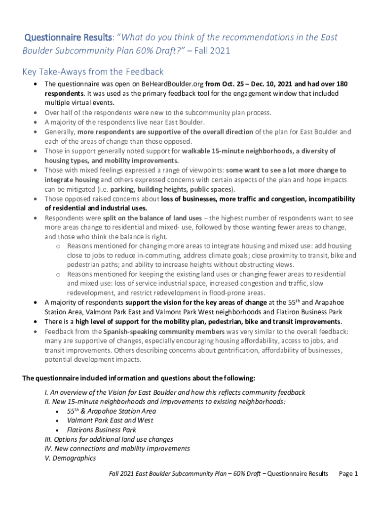 Questionnaire Results: What do you think of the recommendations in the East Boulder Subcommunity Plan 60% Draft? Fall 2021 Key Takeaways from the Feedback The questionnaire was open on BeHeardBoulder.org