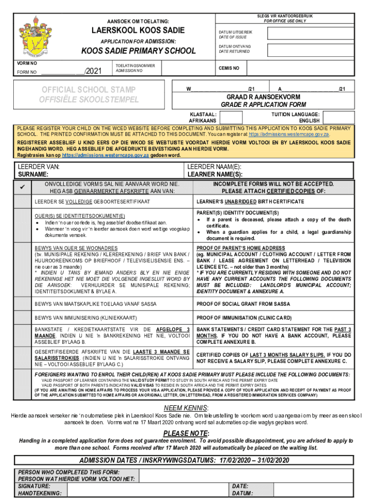 LEGS VIR KANTOORGEBRUIK FOR OFFICE USE ONLYAANSOEK OM RELATING:LAMBSWOOL ZOOS SADIEDATUM UITGEREIK DATE OF ISSUEAPPLICATION FOR ADMISSION:DATUM ONGOING DATE RETURNEDKOOS SADIE PRIMARY SCHOOL FORM