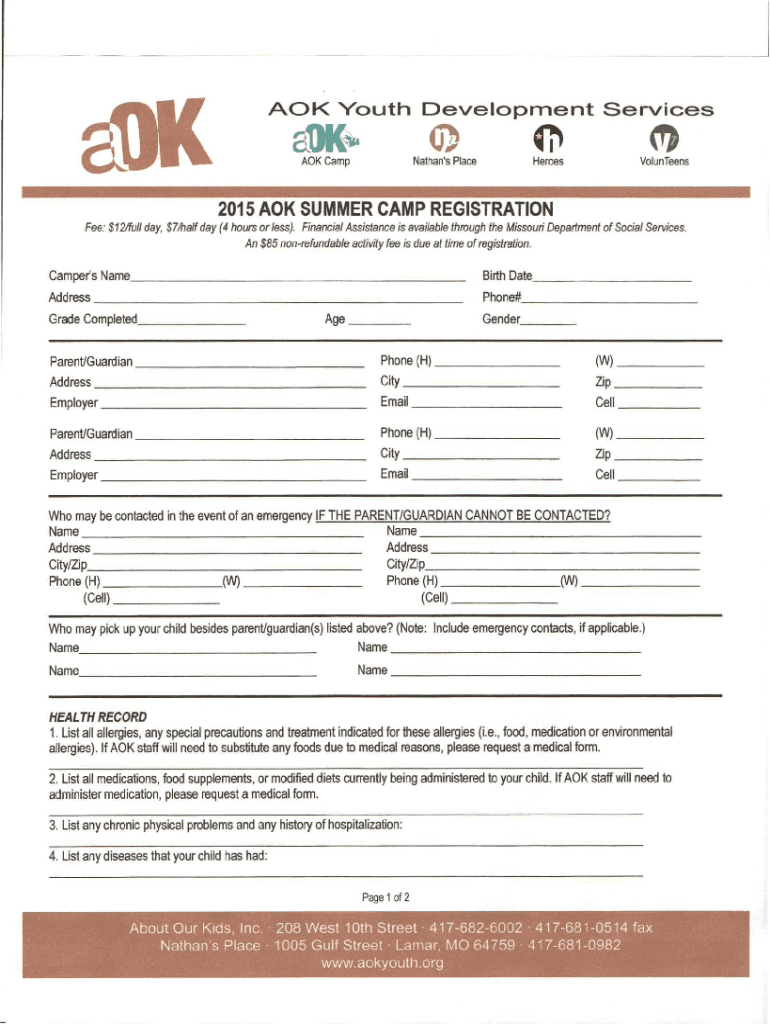 AOK Youth Developmenta1)1($. U)f.\'AOKCampNathan\'s PlaceHeroesServices VolunTeens2015 AOK SUMMER CAMP REGISTRATION Fee: $ 121full day, $7/ha/f day (4 hours or less). Financial Assistance is available