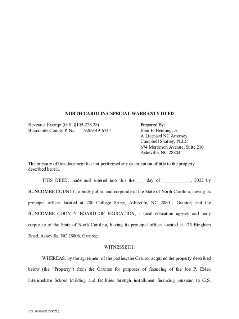 NORTH CAROLINA SPECIAL WARRANTY DEED Revenue: Exempt (G.S. 105228.28) Buncombe County PIN#: 9269496747Prepared By: John F. Henning, Jr. A Licensed NC Attorney Campbell Shaula, LLC 674 Morrison Avenue,