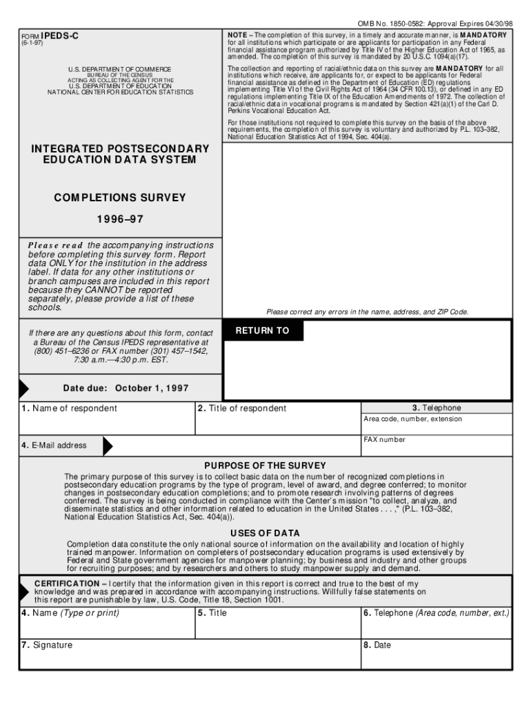 OMB No. 18500582: Approval Expires 04/30/98 FORM IPE DSC (6197)NOTE The completion of this survey, in a timely and accurate manner, is MANDATORY for all institutions which participate or are applicants