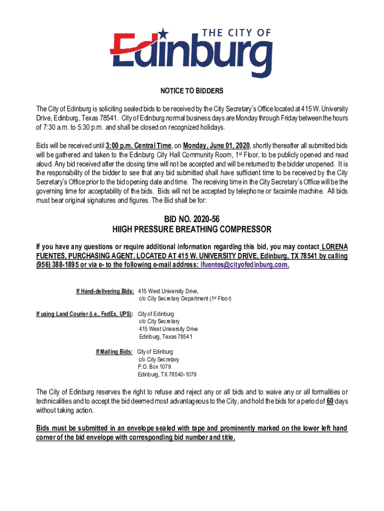 NOTICE TO BIDDERS The City of Edinburg is soliciting sealed bids to be received by the City Secretary's Office located at 415 W. University Drive, Edinburg, Texas 78541. City of Edinburg normal business
