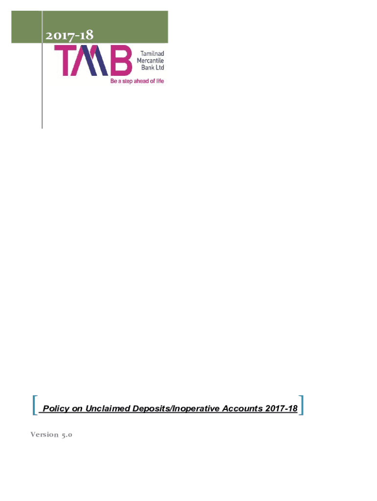 201718[]Policy on Unclaimed Deposits/Inoperative Accounts 201718Version 5.02TABLE OF CONTENTS S. NoContentPage No1 2Introduction Classification of inoperative accounts Transactions / Mode of operations