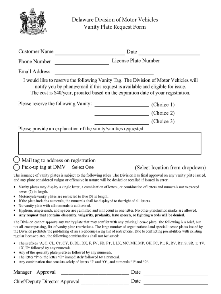Delaware Division of Motor Vehicles Vanity Plate Request FormCustomer Name Date License Plate NumberPhone Number Email Address would like to reserve the following Vanity Tag. The Division of Motor