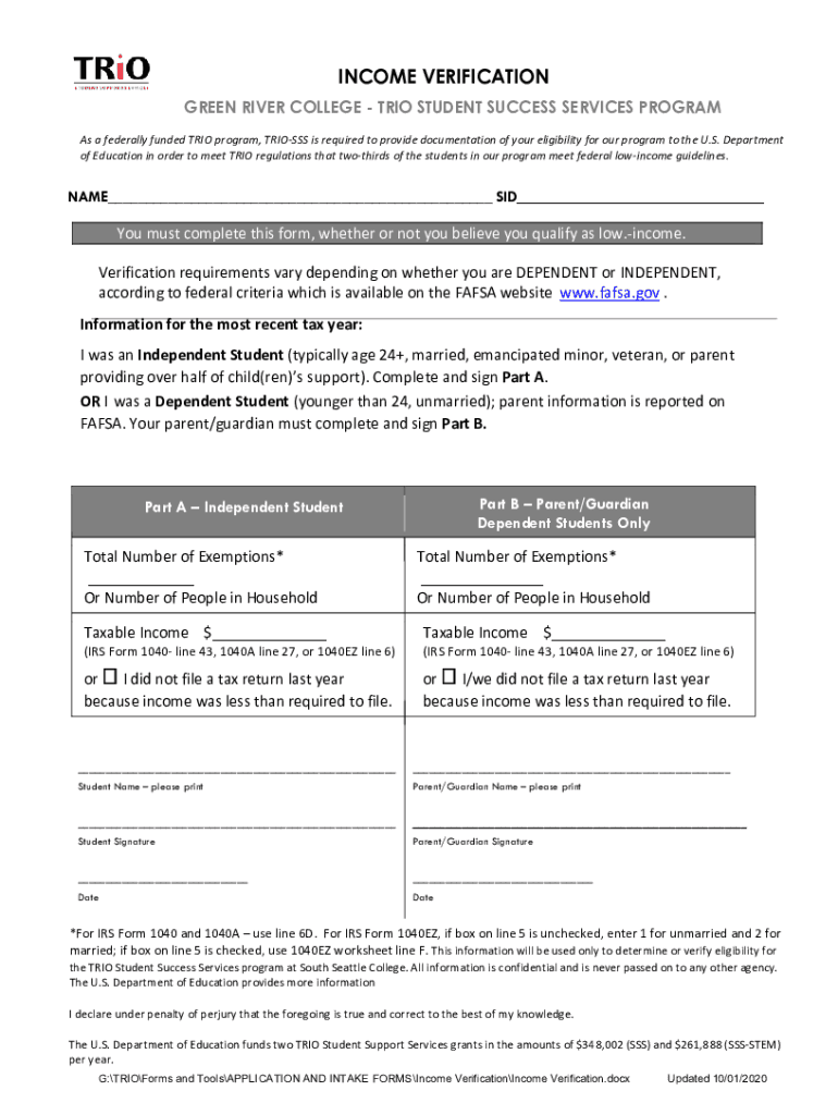 INCOME VERIFICATION GREEN RIVER COLLEGE TRIO STUDENT SUCCESS SERVICES PROGRAM As a federally funded TRIO program, TRIO SSS is required to provide documentation of your eligibility for our program