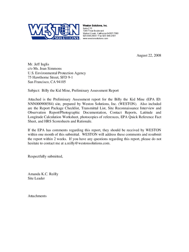 Weston Solutions, Inc. Suite 210 1340 Treat Boulevard Walnut Creek, California 945977580 9259482600 Fax 9259482601 www.westonsolutions.comAugust 22, 2008 Mr. Jeff English c/o Ms. Joan Simmons U.S.