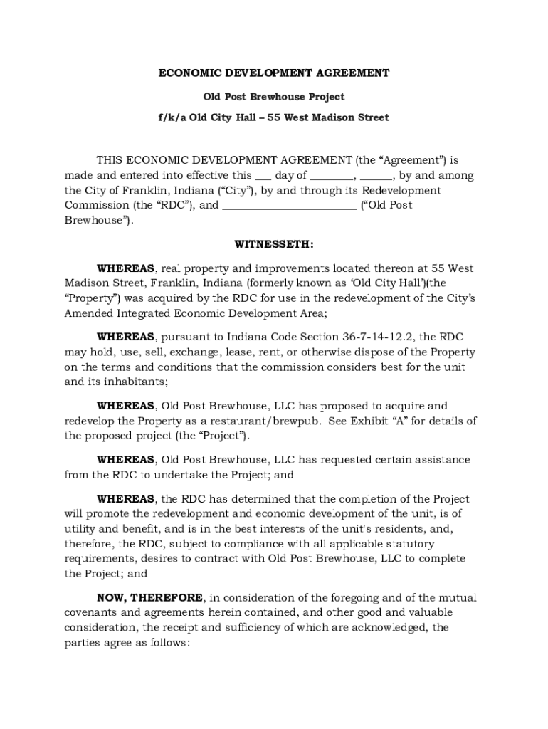 ECONOMIC DEVELOPMENT AGREEMENT Old Post Brew house Project f/k/an Old City Hall 55 West Madison Streets ECONOMIC DEVELOPMENT AGREEMENT (the Agreement) is made and entered into effective this ___ day