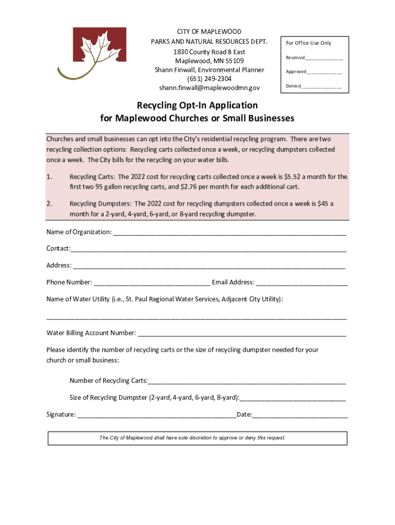 Get the free Recycling Opt-In Application for Maplewood Churches or Small ...