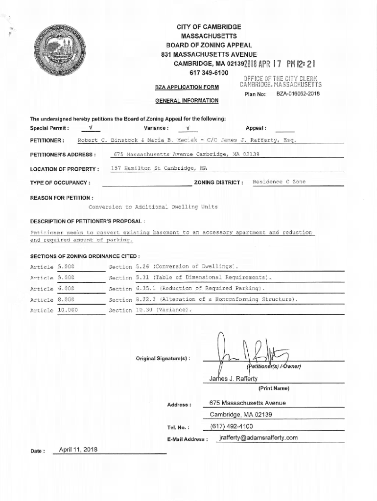 , .CITY OF CAMBRIDGE MASSACHUSETTS BOARD OF ZONING APPEAL 831 MASSACHUSETTS AVENUE CAMBRIDGE, MA 021392018 617 3496100APR 17 PH12: 21OFFICE OF THE CITY CLERK CAMBRIDGE. 1ASSACHU S E TTS BZA APPLICATION