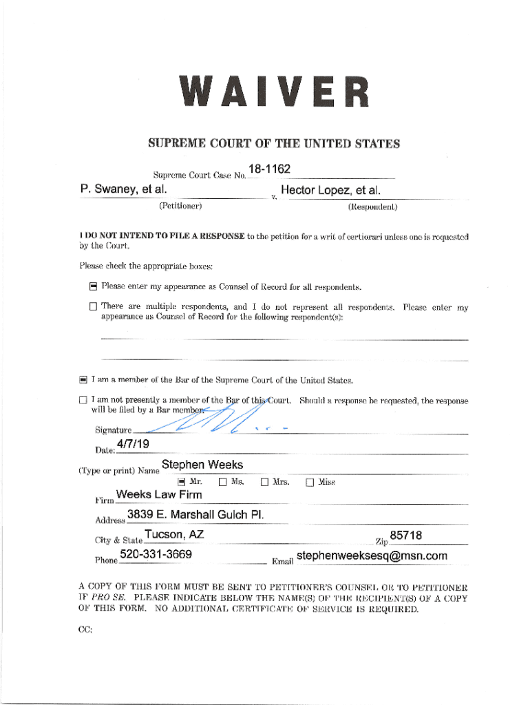 WAIVER SUPREME COURT OF THE United States Supreme Court Case No.181162P. Shana, et al. Hector Lopez, et al.(Petitioner)(Respondent)I DO NOT INTEND TO FILE A RESPONSE to the petition for by the Court.