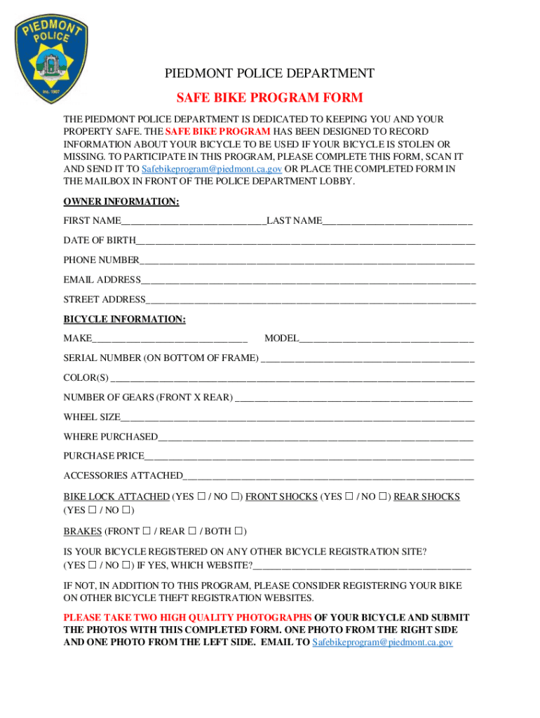 PIEDMONT POLICE DEPARTMENT SAFE BIKE PROGRAM FORM THE PIEDMONT POLICE DEPARTMENT IS DEDICATED TO KEEPING YOU AND YOUR PROPERTY SAFE. THE SAFE BIKE PROGRAM HAS BEEN DESIGNED TO RECORD INFORMATION ABOUT