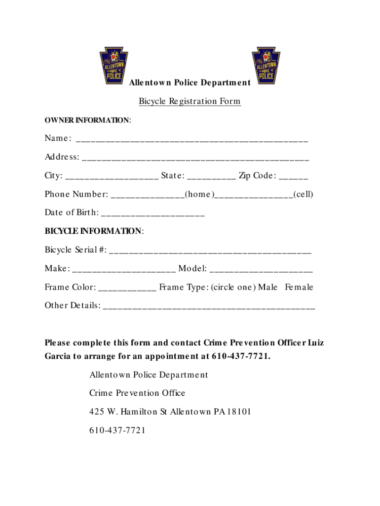Allentown Police Department Bicycle Registration Form OWNER INFORMATION:Name: ___ Address: ___ City: ___ State: ___ Zip Code: ___ Phone Number: ___(home)___(cell) Date of Birth: ___ BICYCLE INFORMATION: