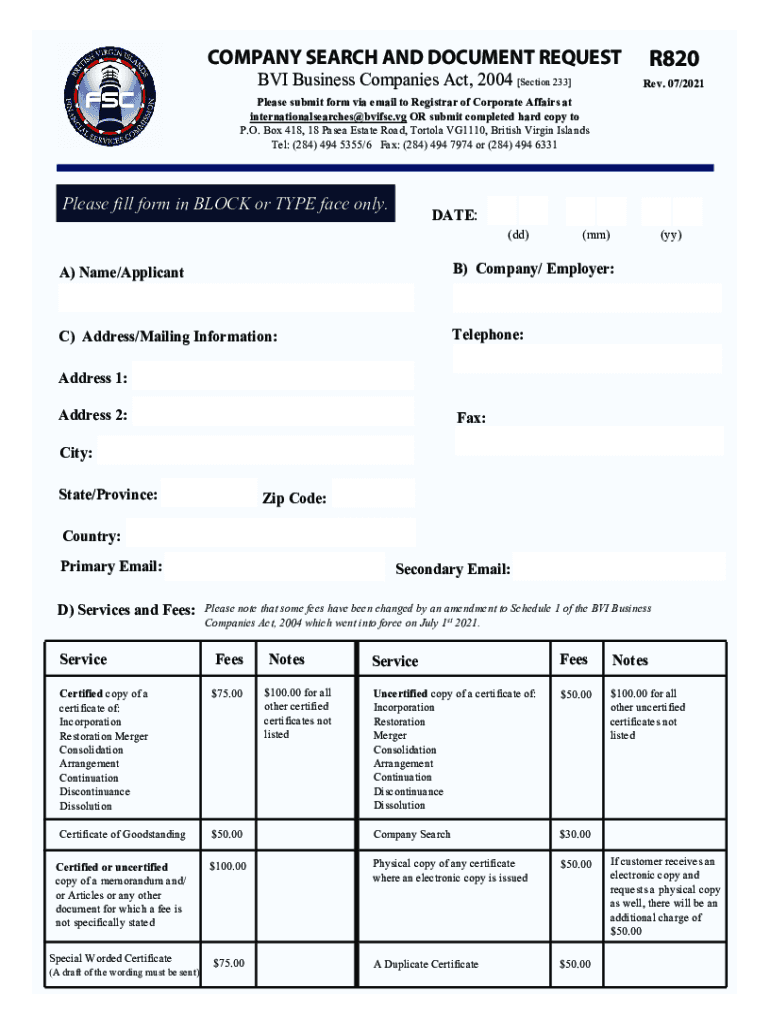R820COMPANY SEARCH AND DOCUMENT REQUEST BVI Business Companies Act, 2004 [Section 233×Rev. 07/2021Please submit form via email to Registrar of Corporate Affairs at international searches×AVIFs.VG