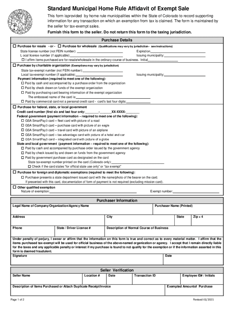 Standard Municipal Home Rule Affidavit of Exempt Sale This form is provided by home rule municipalities within the State of Colorado to record supporting information for any transaction on which an