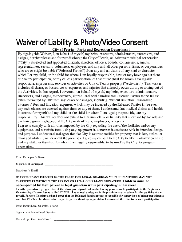 Waiver of Liability & Photo/Video Consent City of Peoria Parks and Recreation Department By signing this Waiver, I, on behalf of myself, my heirs, executors, administrators, successors, and assigns,