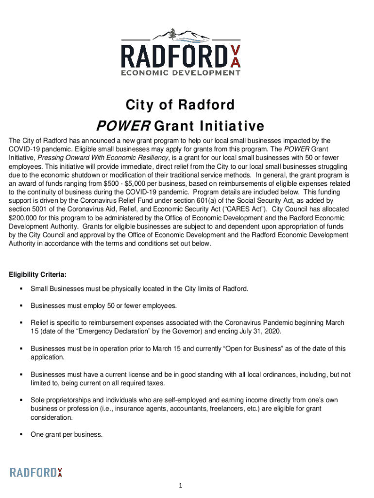 City of RadfordPOWER Grant Initiative The City of Bradford has announced a new grant program to help our local small businesses impacted by the COVID-19 pandemic. Eligible small businesses may apply