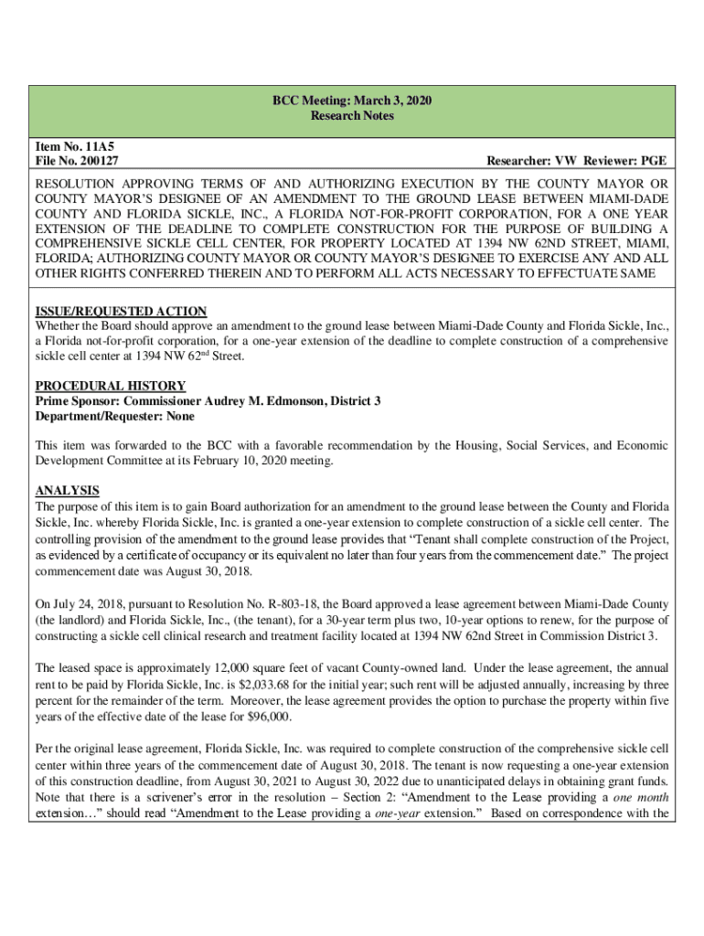 BCC Meeting: March 3, 2020, Research Notes Item No. 11A5 File No. 200127Researcher: VW Reviewer: PREREVOLUTION APPROVING TERMS OF AND AUTHORIZING EXECUTION BY THE COUNTY MAYOR OR COUNTY MAYORS DESIGNEE