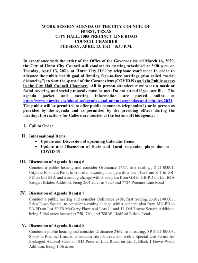 WORK SESSION AGENDA OF THE CITY COUNCIL OF HURST, TEXAS CITY HALL, 1505 PRECINCT LINE ROAD COUNCIL CHAMBER TUESDAY, APRIL 13, 2021 5:30 P.M. ___In accordance with the order of the Office of the Governor