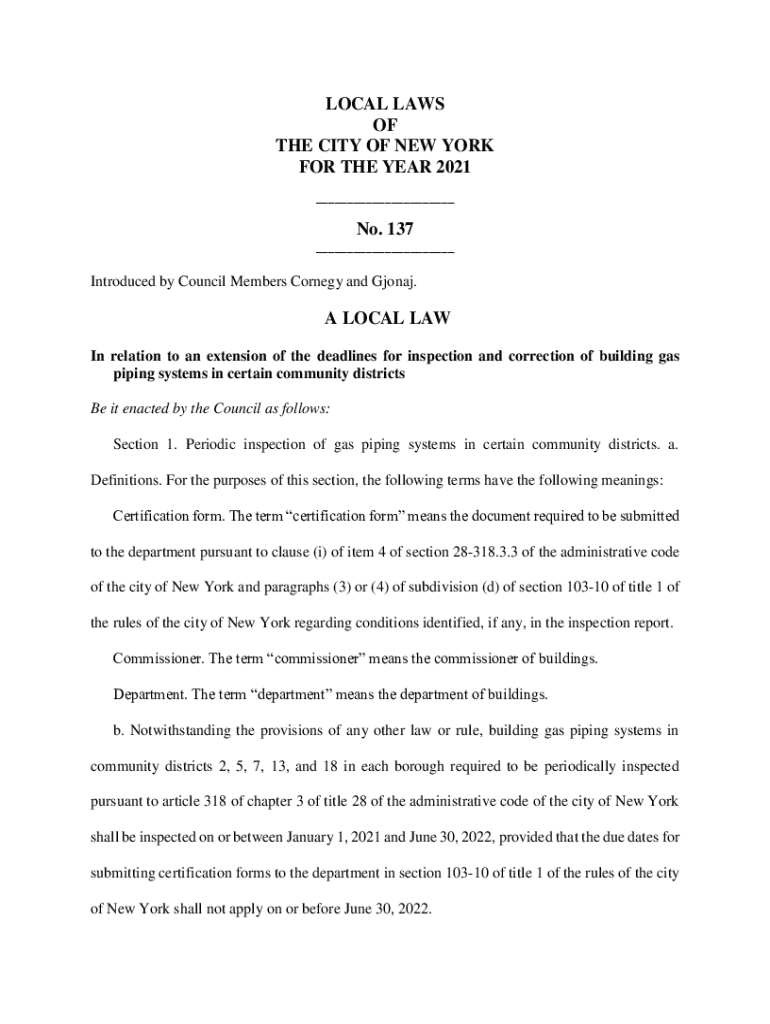 LOCAL LAWS OF THE CITY OF NEW YORK FOR THE YEAR 2021 ___No. 137 ___Introduced by Council Members Corner and Jonas. A LOCAL LAW In relation to an extension of the deadlines for inspection and correction