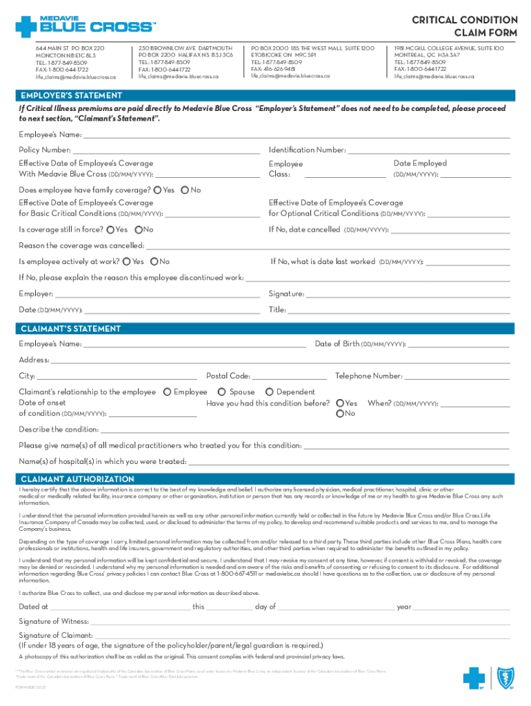 CRITICAL CONDITION CLAIM FORM 644 MAIN ST PO BOX 220 MONCTON NB E1C 8L3 TEL: 18778498509 FAX: 18006441722 life×claims×Melanie.blue cross.ca230 BROWNLOW AVE DARTMOUTH PO BOX 2200 HALIFAX NS B3J 3C6