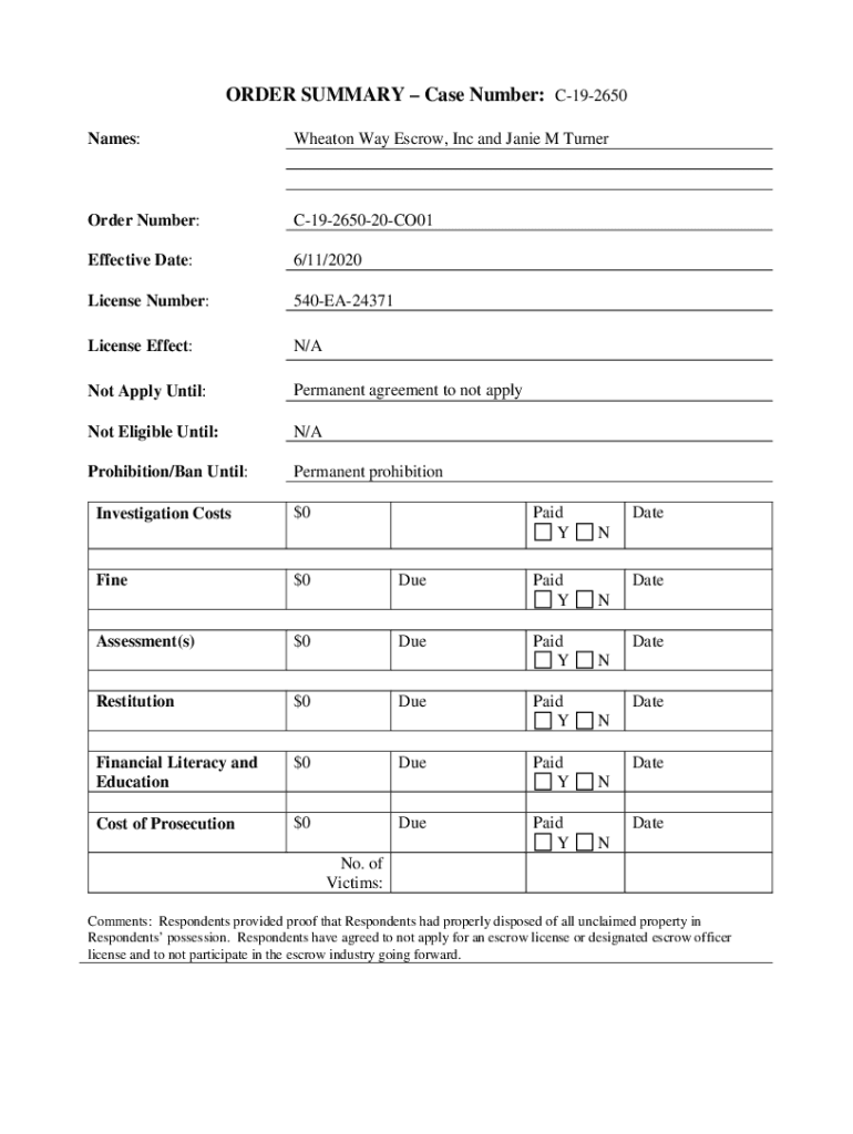 ORDER SUMMARY Case Number: C192650 Names:Wheaton Way Escrow, Inc and Janie M TurnerOrder Number:C19265020CO01Effective Date:6/11/2020License Number:540EA24371License Effect:N/Not Apply Until:Permanent