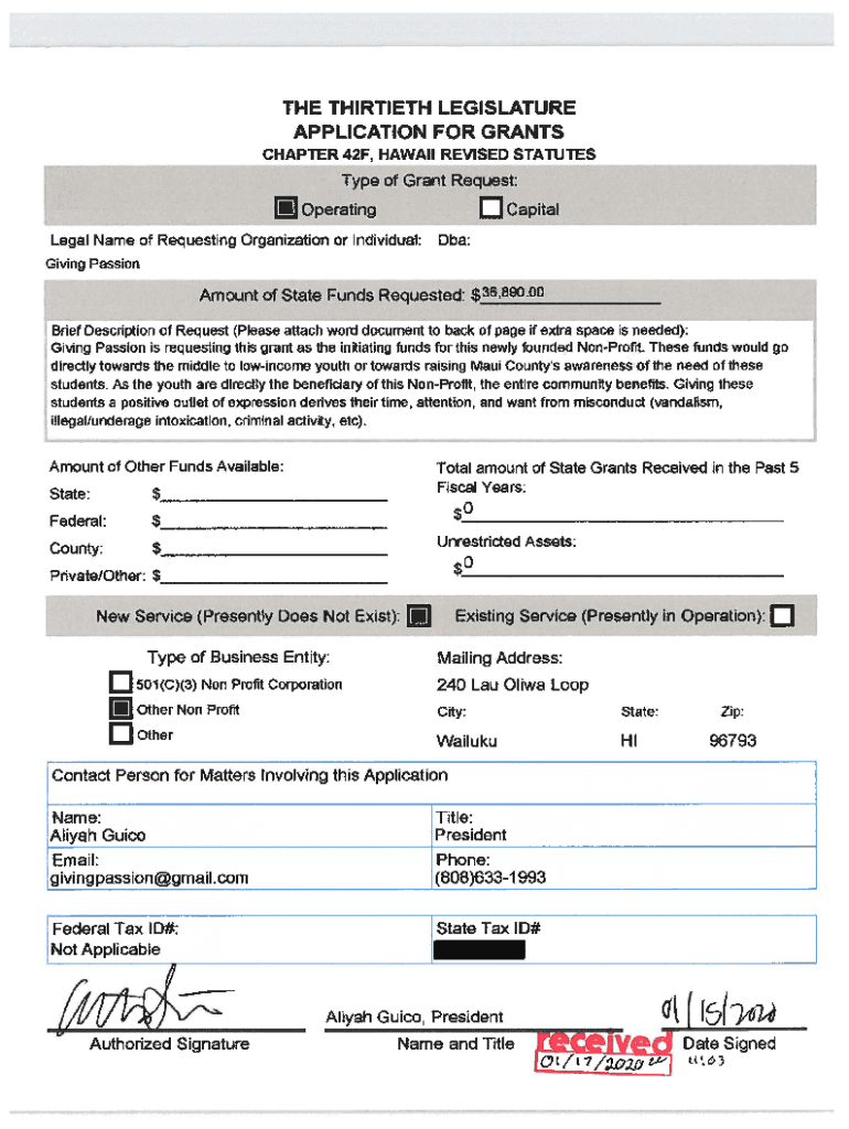 THE THIRTIETH LEGISLATURE APPLICATION FOR GRANTS Chapter 42F, HAWAII REVISED STATUlESType of Grant Request'd Capitalism OperatingLegaI Name of Requesting Organization or Individual:Obey:Giving PassionAmount