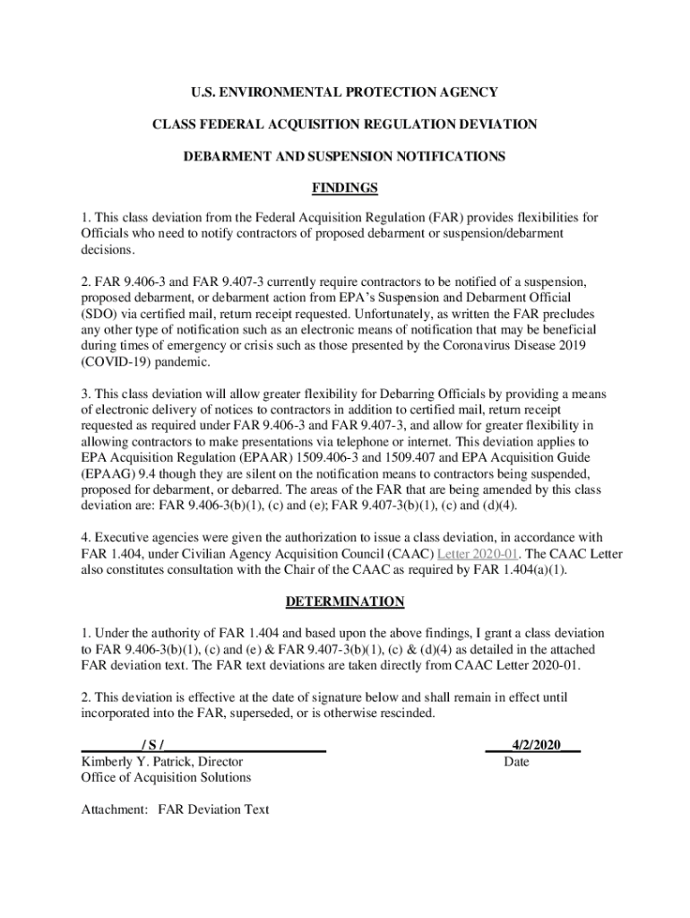 U.S. ENVIRONMENTAL PROTECTION AGENCY CLASS FEDERAL ACQUISITION REGULATION DEVIATION DEBARMENT AND SUSPENSION NOTIFICATIONS FINDINGS 1. This class deviation from the Federal Acquisition Regulation
