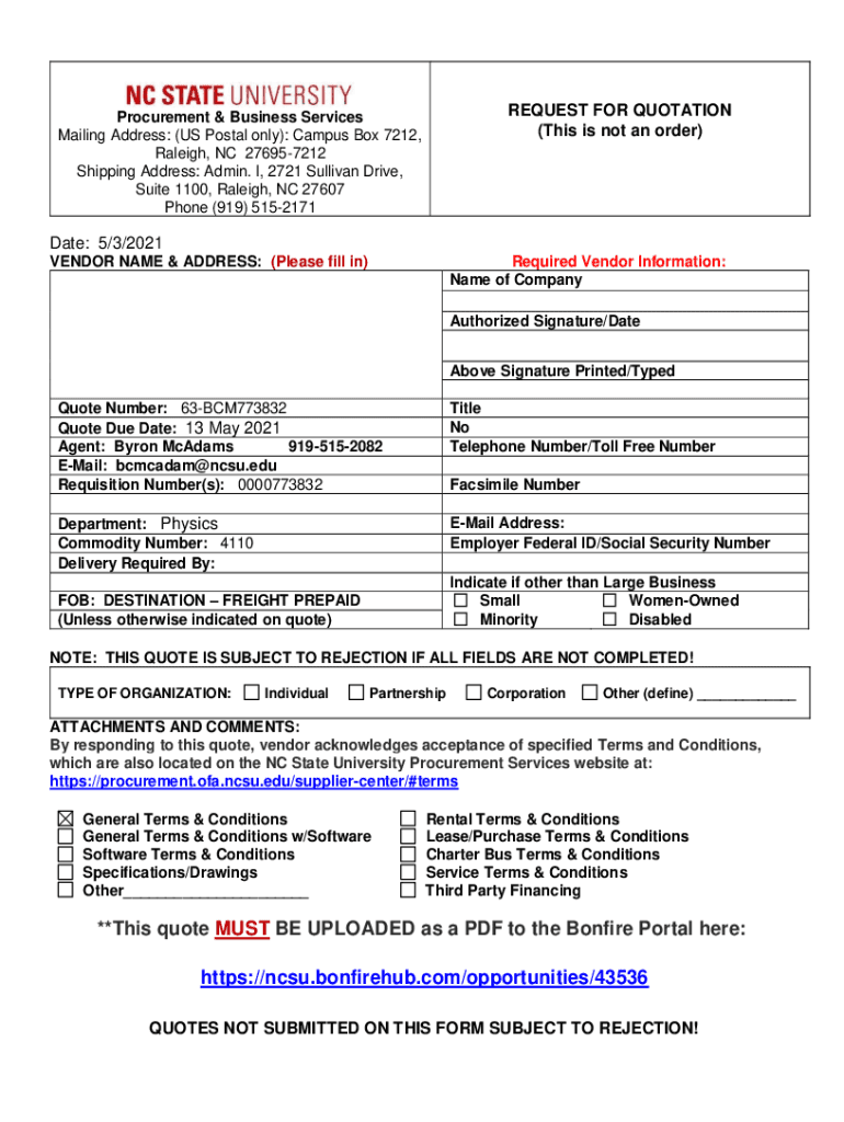 REQUEST FOR QUOTATION (This is not an order)Procurement & Business Services Mailing Address: (US Postal only): Campus Box 7212, Raleigh, NC 276957212 Shipping Address: Admin. I, 2721 Sullivan Drive,
