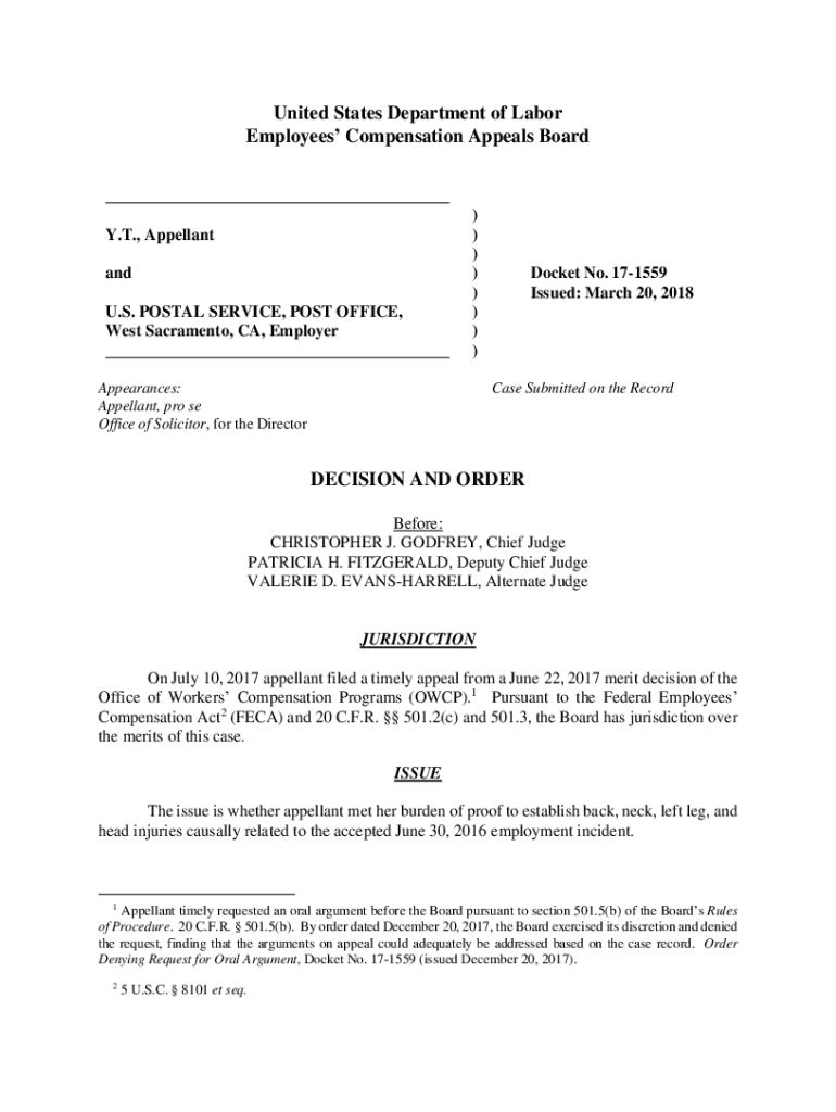 United States Department of Labor Employees Compensation Appeals Board ___ Y.T., Appellant and U.S. POSTAL SERVICE, POST OFFICE, West Sacramento, CA, Employer ___))))))))Appearances: Appellant, pro