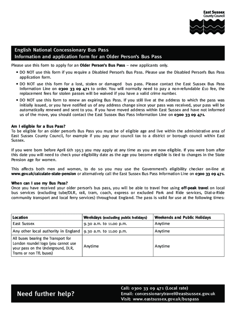 English National Concessionary Bus Pass Information and application form for an Older Persons Bus Pass Please use this form to apply for an Older Persons Bus Pass new applicants only. D O NOT use