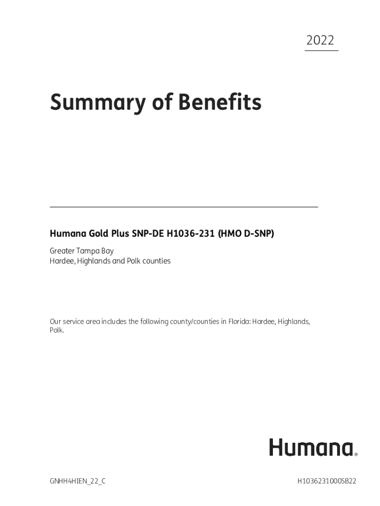 SBOSB0352022Summary of BenefitsHumana Gold Plus SNIDE H1036231 (HMO DSP) Greater Tampa Bay Harder, Highlands and Polk counties service area includes the following county/counties in Florida: Harder,