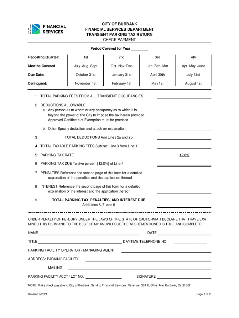 CITY OF BURBANK FINANCIAL SERVICES DEPARTMENT TRANSIENT PARKING TAX RETURN CHECK PAYMENT Period Covered for Year ___ Reporting Quarter:1st2nd3rd4thJuly Aug Sept Oct Nov Deccan Feb Mar Apr May Undue