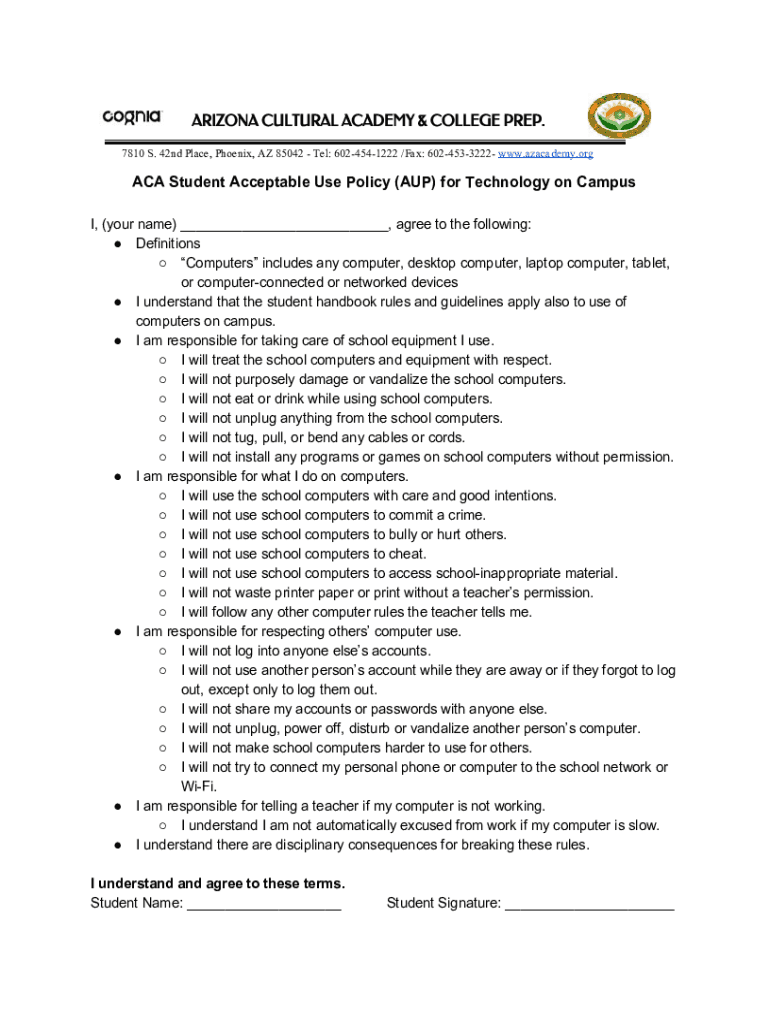 ARIZONA CULTURAL ACADEMY & COLLEGE PREP. 7810 S. 42nd Place, Phoenix, AZ 85042 Tel: 6024541222 /Fax: 6024533222 www.azacademy.orgACA Student Acceptable Use Policy (AUP) for Technology on Campus I,