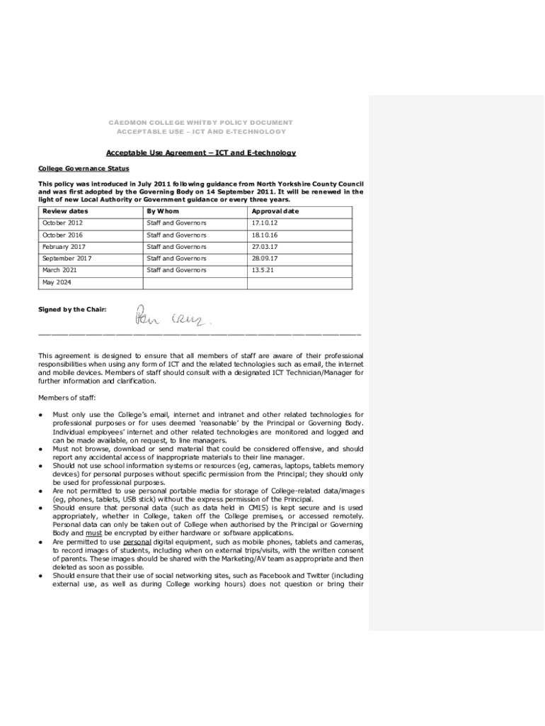CAEDMON COLLEGE WHITBY POLICY DOCUMENT ACCEPTABLE USE ICT AND ETECHNOLOGYAcceptable Use Agreement ICT and Technology College Governance Status This policy was introduced in July 2011 following guidance