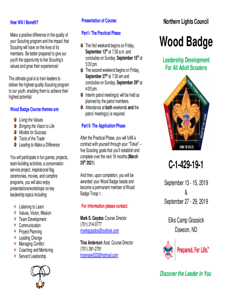How Will I Benefit? Presentation of Course:Make a positive difference in the quality of your Scouting program and the impact that Scouting will have on the lives of its members. Be better prepared