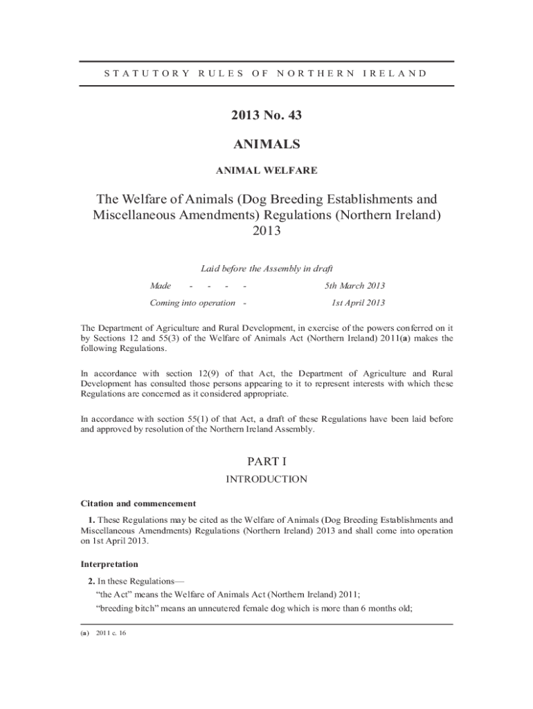 STATUTORY RULES OF NORTHERN IRELAND2013 No. 43 ANIMALS ANIMAL Welfare of Animals (Dog Breeding Establishments and Miscellaneous Amendments) Regulations (Northern Ireland) 2013 Laid before the Assembly