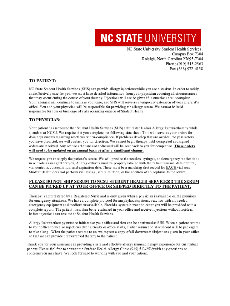 NC State University Student Health Services Campus Box 7304 Raleigh, North Carolina 276957304 Phone (919) 5152563 Fax (888) 9724158 TO PATIENT: NC State Student Health Services (SHS) can provide allergy
