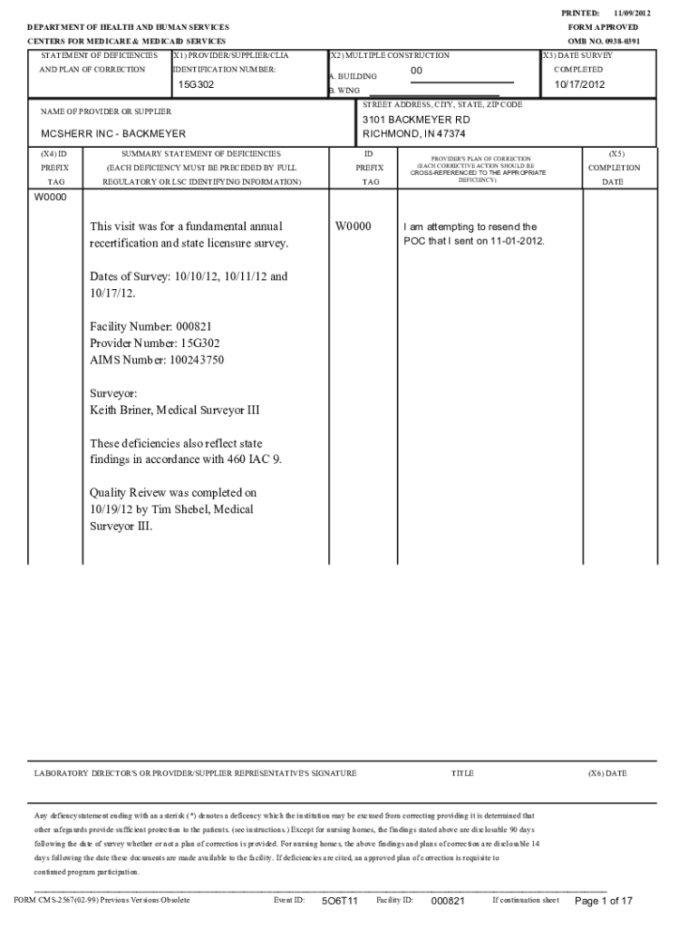 PRINTED: DEPARTMENT OF HEALTH AND HUMAN SERVICES CENTERS FOR MEDICARE & MEDICAID SERVICES STATEMENT OF DEFICIENCIES(X1) PROVIDER/SUPPLIER/LIGAND PLAN OF CORRECTIONIDENTIFICATION NUMBER:15G30211/09/2012FORM