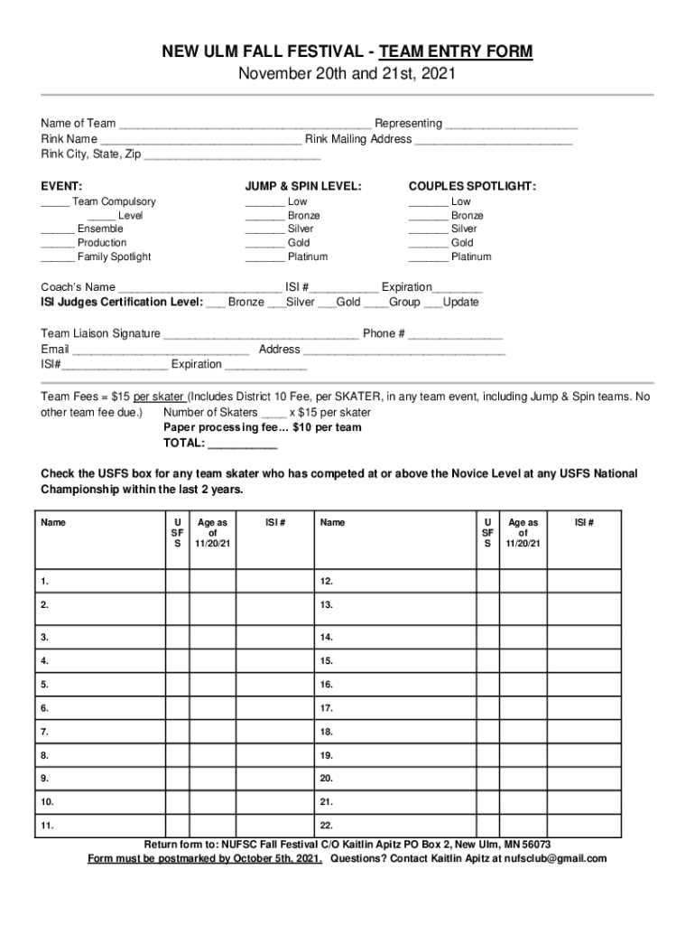 NEW ULM FALL FESTIVAL TEAM ENTRY FORM November 20th and 21st, 2021 Name of Team ___ Representing ___ Rink Name ___ Rink Mailing Address ___ Rink City, State, Zip ___ EVENT:JUMP & SPIN LEVEL:COUPLES