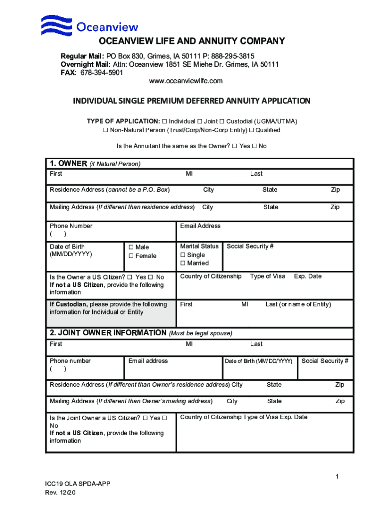 Ocean view Life and Annuity Company BUSINESS APPLICATION CHECKLIST: Individual Single Premium Deferred Annuity Application (Form Code: ICC19 OLA SPAATZ) NOTE: Required Harbourview MultiYear Guaranteed