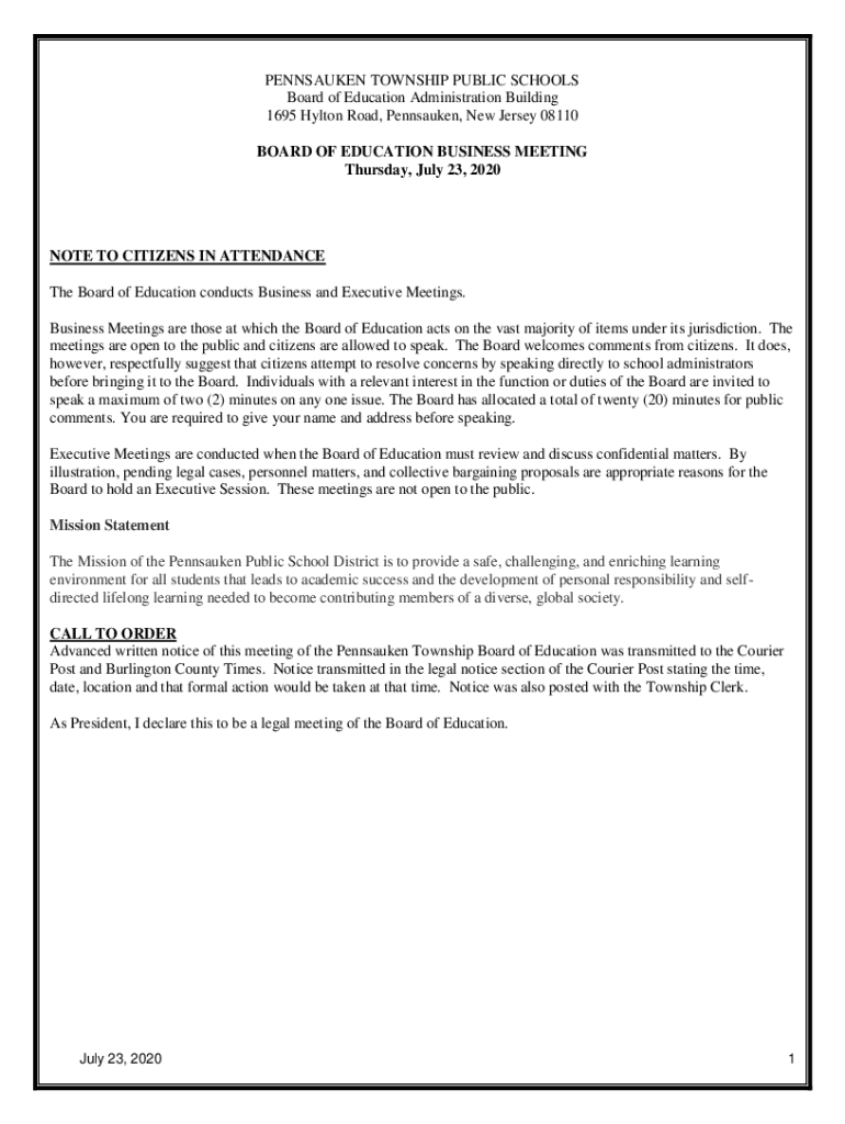PENNSAUKEN TOWNSHIP PUBLIC SCHOOLS Board of Education Administration Building 1695 Hilton Road, Pennsauken, New Jersey 08110 BOARD OF EDUCATION BUSINESS MEETING Thursday, July 23, 2020NOTE TO CITIZENS