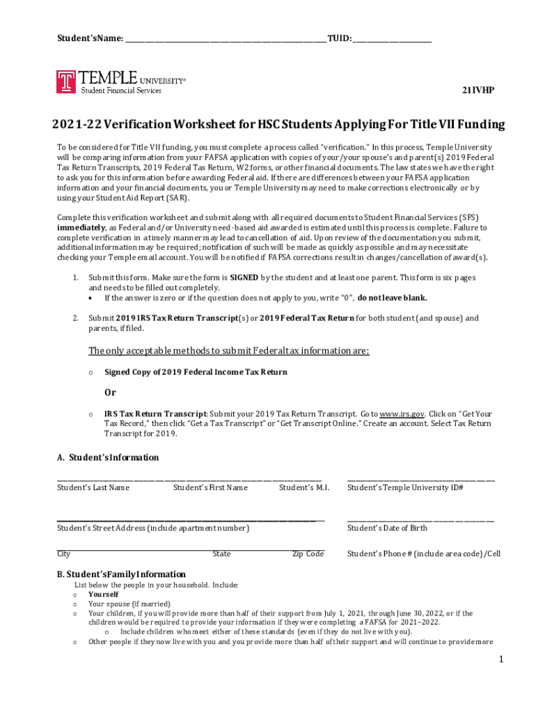 Students Name: ___ QUID: ___21IVHP202122 Verification Worksheet for HSC Students Applying For Title VII Funding To be considered for Title VII funding, you must complete a process called verification.